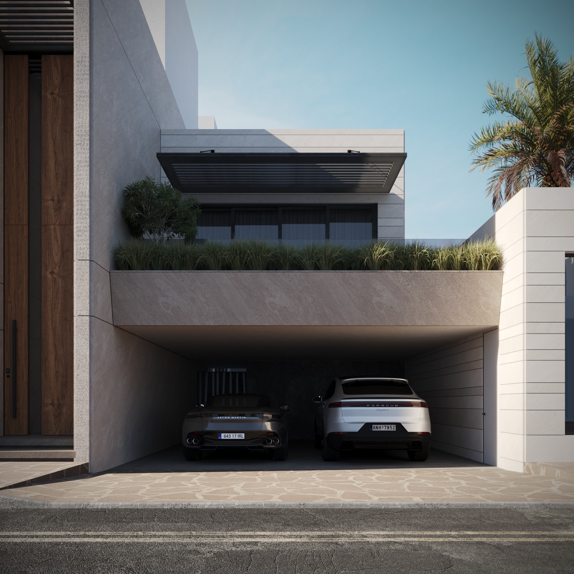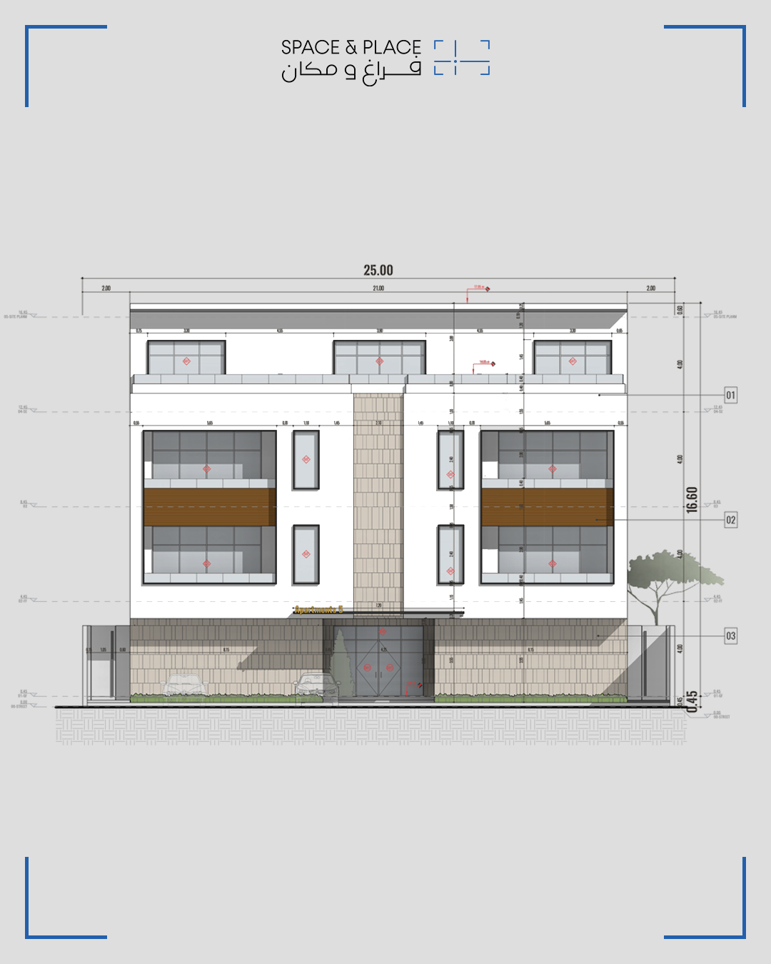 تتميز الواجهة بتصميم عصري وأنيق، باستخدام حجر الترافنتين الفاخر والبورسلان